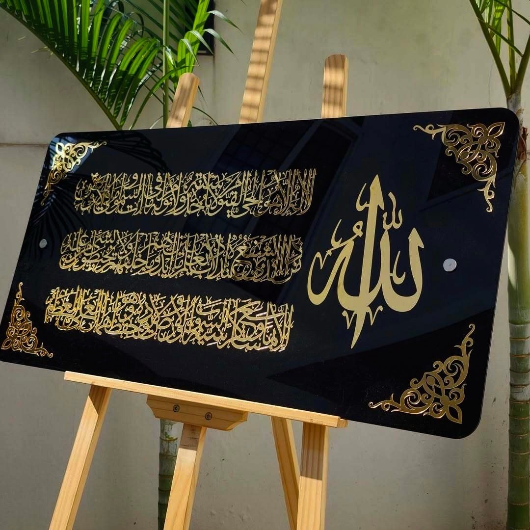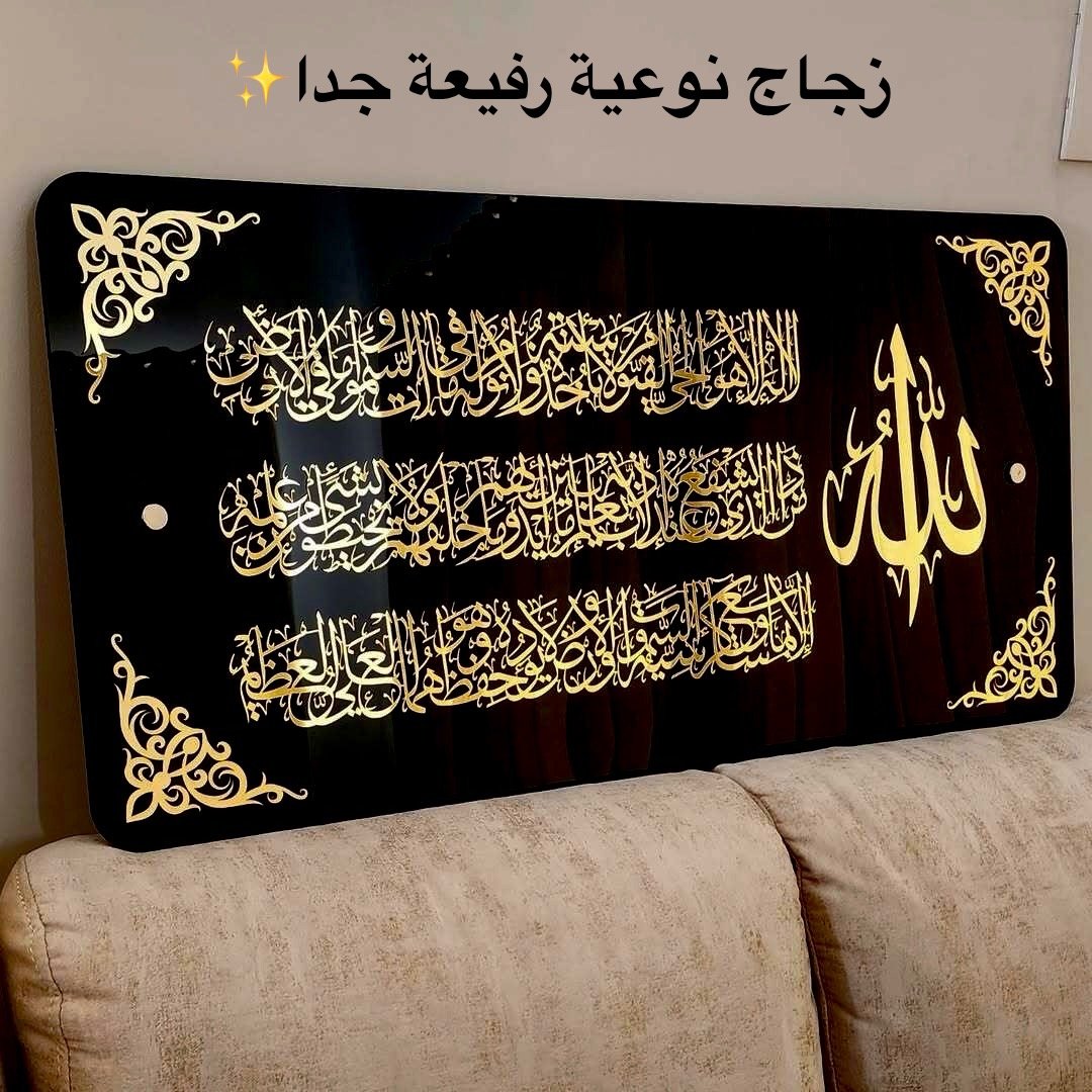 الأناقة التي يستحقها منزلك 🏠 كادر آية الكرسي الزجاجي الأسود الفخم الذي يعطي هيبة بين ضيوفك 💎 واية الكرسي بمادة الاكليريك الذهبي الخالص 👑بحجمه الكبير (120سم 60سم ) متوفر الآن. اطلب قطعة الفخامة الخاصة بك اليوم وتصلك حتى باب دارك في أي ولاية 🚚
